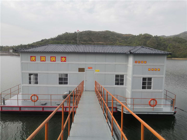 茌平县东邢水厂项目取水浮船泵站正在安装中。